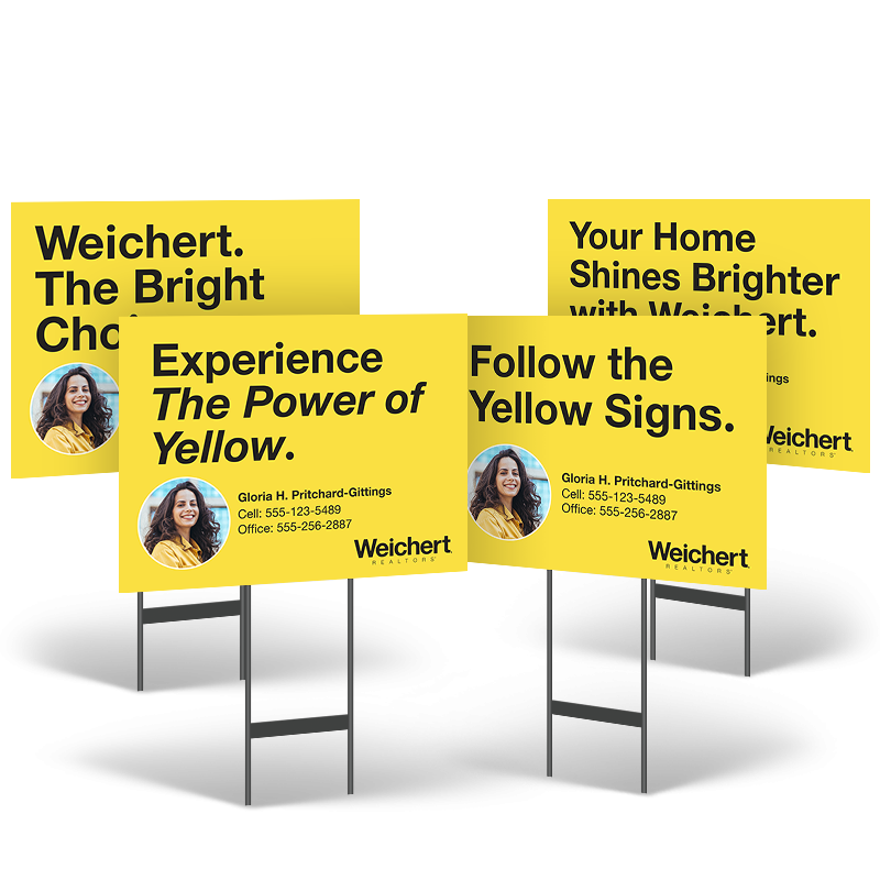 Boost your real estate presence with the 18"x24" Styrene Yard Sign, designed exclusively for Weichert. Featuring double-sided printing, this sign ensures maximum visibility from all angles, making it easy to capture the attention of potential buyers. Mounted on a durable black powder-coated stand, it offers a professional and polished look while withstanding outdoor elements. The high-quality styrene panel delivers vibrant colors and crisp graphics, reinforcing the "Experience The Power of Yellow" branding. Whether for open houses or property listings, this sign is the perfect marketing tool to enhance your visibility and attract more clients.